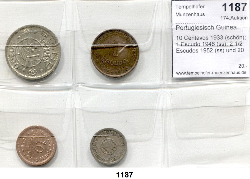 18:03 1187 18,00 €![]() 10 Centavos 1933 (schön); 1 Escudo 1946 (ss); 2 1/2 Escudos 1952 (ss) und 20 Escudos 1952 (ss-vz). Schön 2, 7, 12, 16. KM 2, 7, 9, 11. LOT. 4 Stück. Katalogseite