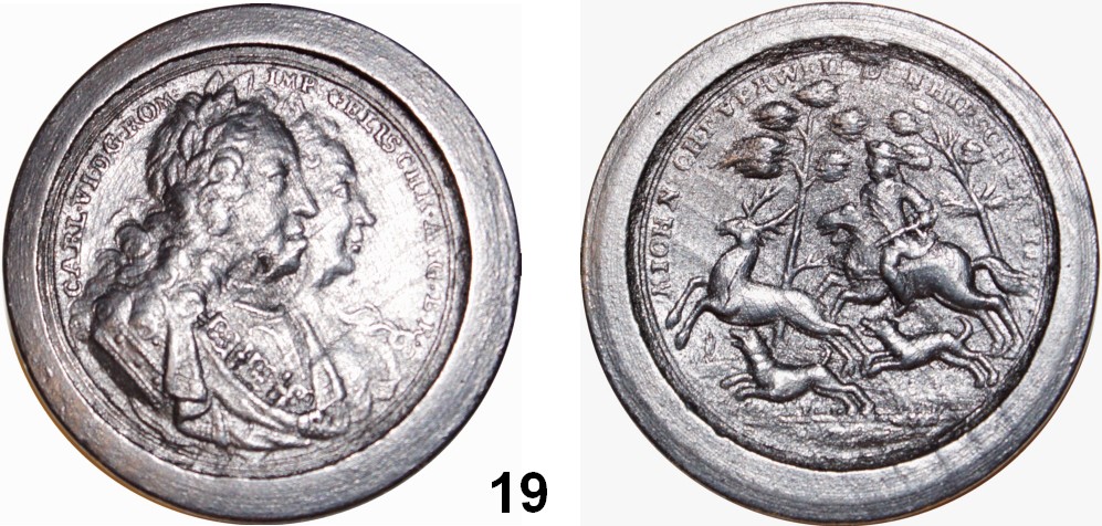 Schwarzer Brettstein o.J. Doppelporträt n. r. / Jagdszene. 40,5 mm. 10,1 mm stark. 8,74 g.