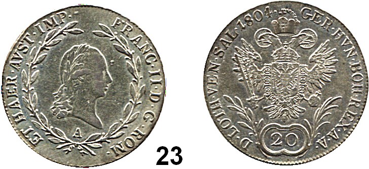 0023. Haus Habsburg Franz II. 1792 – 1806 (1835) 20 Kreuzer 1804 A, Wien. Herinek 679. Jl. 153. KM 2140. Römisch Deutsches Reich Katalogseite Auktion: 164 Losnummer: 0023 Erhaltung: Sehr schön – vorzüglich Schätzpreis: 40,00 € Zuschlag: 50,00 €