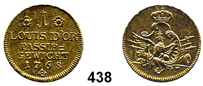 Passiergewicht 1768 (Messing) : 1 Louis d’or. 23,5 mm. 6,55 g. Tewes 24. Olding 497.