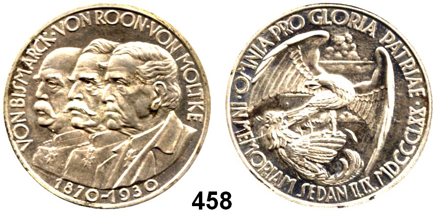 Silbermedaille 1930 (O. Glöckler). 60. Jahrestag der Schacht bei Sedan. Brustbilder von Bismarck, von Roon und von Moltke. / Adler beim Kampf mit dem gallischen Hahn. Rand: MÜNZAMT WIEN A 835. 36 mm. 22,39 g. Vgl. Buchholz/Fried 188. , auf die Vollendung des Reichstagsgebäudes in Berlin. Brustbild links in Uniform mit Helm. / Ansicht des Gebäuders. 33 mm. 13 g. Bennert 136.