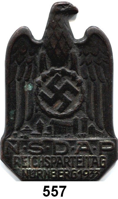 Tagungsabzeichen 1933. Bronze, einseitig. NSDAP Reichsparteitag Nürnberg 1933. 33,8 x 51,6 mm. 32,15 g.