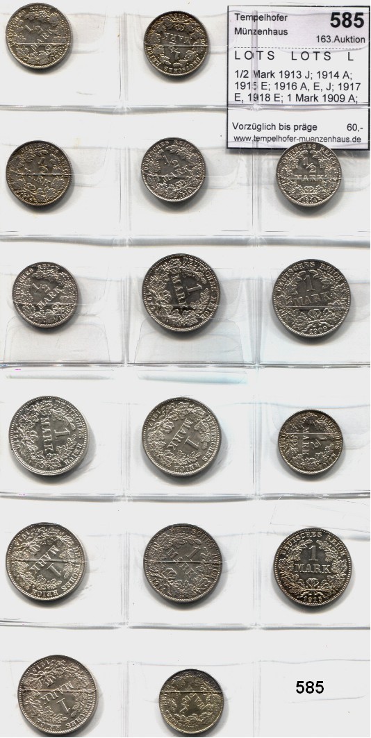1/2 Mark 1913 J; 1914 A; 1915 E; 1916 A, E, J; 1917 E, 1918 E; 1 Mark 1909 A; 1910 D; 1912 D, E; 1914 A, E; 1915 D, E. Jaeger 16(8) und 17(8). LOT 16 Stück.