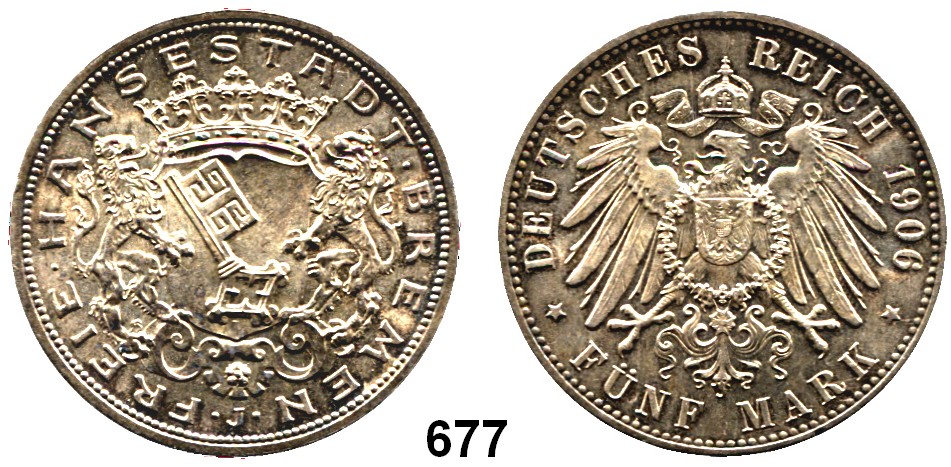 0677. Bremen 5 Mark 1906. Reichsmünzen Bremen Katalogseite Auktion:Auktion: 158 Losnummer: 0677 Erhaltung: Feine Patina, fast prägefrisch Schätzpreis: 250,00 € Zuschlag: 0 € Literaturnummer: 60
