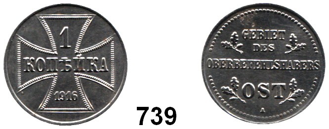 0739. Oberbefehlshaber Ost 1 Kopeke 1916 A. Besetzte Gebiete - Kolonien - Danzig Katalogseite Auktion: 160 Losnummer: 0739 Erhaltung: Vorzüglich – prägefrisch Literaturnummer: 601 Schätzpreis: 30,00 € Zuschlag: 50 €