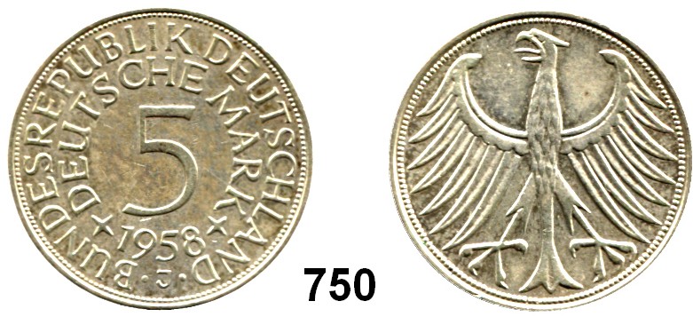 0750. B U N D E S R E P U B L I K 5 Mark 1958 J Bundesrepublik Katalogseite Auktion: 164 Losnummer: 0750 Erhaltung: Sehr schön Literaturnummer: 387 Schätzpreis: 200,00 € Zuschlag: 250,00 €