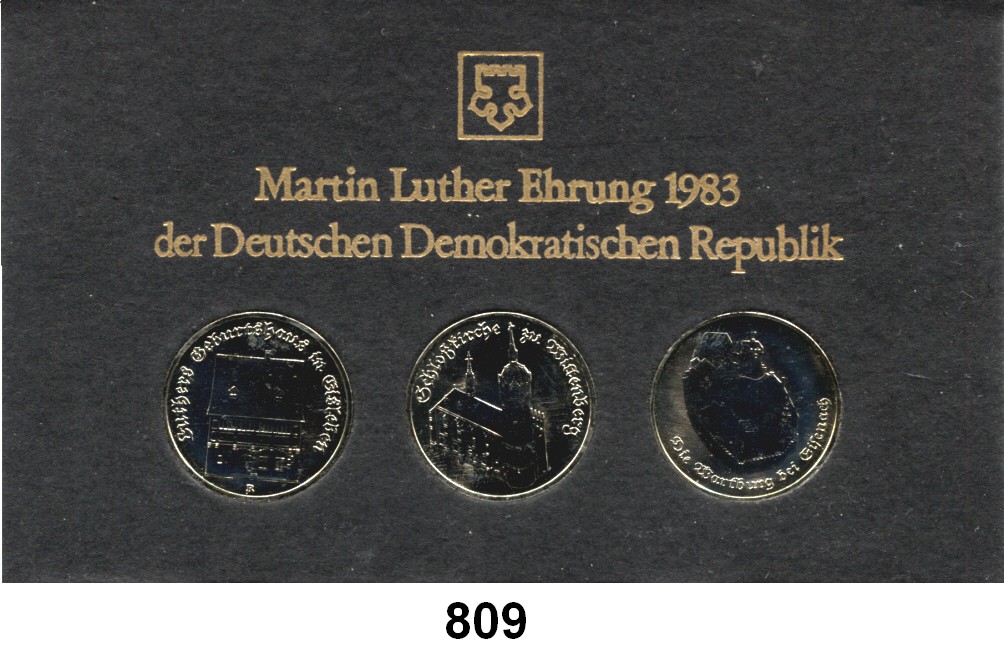 Martin-Luther-Ehrung der DDR. 5 Mark 1983 Wartburg , Luthers Geburtshaus in Eisleben, Schloßkirche in Wittenberg. Im Münzrahmen mit Aufschrift „Martin Luther Ehrung 1983 der Deutschen Demokratischen Republik“. Jaeger S. 890.