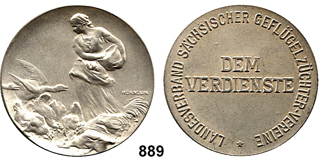 Versilberte Bronzemedaille o.J. (Hörnlein) Landesverband sächsischer Geflügelzüchter-Vereine. „DEM VERDIENSTE“. AFA 303. 42,3 mm. 31,21 mm.