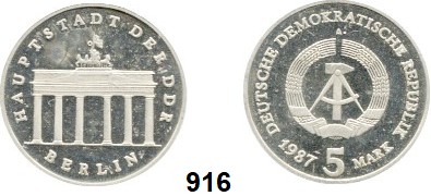 0916. Deutsche Demokratische Republik 5 Mark 1987. Brandenburger Tor. Index: Berlin Deutsche Demokratische Republik Katalogseite Auktion: 174 Losnummer: 0916 Erhaltung: Polierte Platte Literaturnummer: 1536 Schätzpreis: 25,00 €