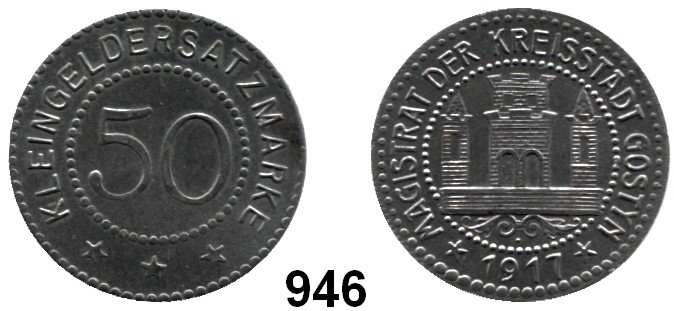 0946. 0 Gostyn (Posen) Magistrat. 50 Pfennig 1917. Rö. Fä. Menzel 9346.12. Funck 165.6 Ab. Notmünzen Marken und Zeichen Katalogseite Auktion: 164 Losnummer: 0946 Erhaltung: Vorzüglich – prägefrisch Literaturnummer: 9346.12 Schätzpreis: 30,00 € Zuschlag: 32,00 €