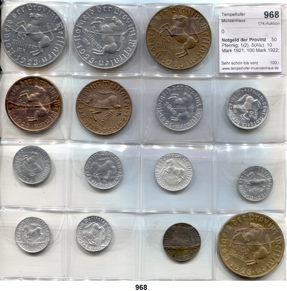 Notgeld der Provinz. 50 Pfennig; 1(2), 5(Alu), 10 Mark 1921; 100 Mark 1922; 50 und 500 Mark 1923 (Hülshoff); 10.000 Mark; 1/4(2); 2; 50(3) Millionen Mark 1923 LOT. 15 Stück