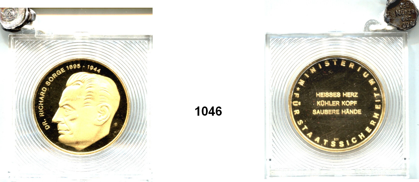 Goldmedaille o.J. (1989, 900 fein) des Ministeriums für Staatssicherheit. Richard Sorge, Kopf links. // HEISSES HERZ / KÜHLER KOPF / SAUBERE HÄNDE. 33 mm. 37,8 g. Im Originaletui mit Zertifikat des VEB Münze der DDR, Berlin (späterer Druck). Auflage: 30 Exemplare. Höchste nicht staatliche Auszeichnung.