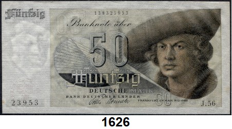 1626. BUNDESREPUBLIK DEUTSCHLAND 50 Deutsche Mark 9.12.1948. „J 56“. Ros. BRD-2. Papiergeld Katalogseite Auktion: 173 Losnummer: 1626 Erhaltung: Eckknick, kleiner Fleck, sonst kassenfrisch Literaturnummer: 254 Schätzpreis: 40,00 € Zuschlag: 75,00 €