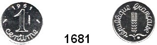 1681. Frankreich 5. Republik seit 1958 1 Centime 1961. ESSAI. PIEDFORT-Prägung. Chrom-Stahl. Vgl. KM P 341. Index: Probe (Essai) Ausländische Münzen Katalogseite Auktion: 163 Losnummer: 1681 Erhaltung: Stempelglanz Schätzpreis: 30,00 € Zuschlag: 28 €