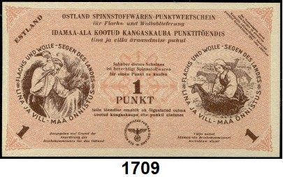 Ostland Spinnstoffwaren-Punktwertschein. 1 Punkt o.D.(-30.4.1944). Ohne KN. Drfa. deutsch, mit „Riga No 6308“. Grabowski/Huschka/Schamberg ES 5 c.