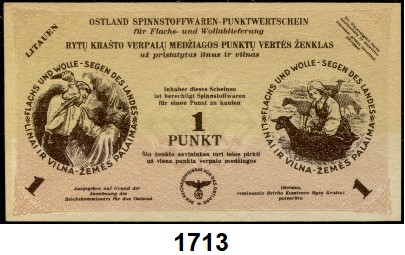1713. Besatzungsausgaben des II. Weltkrieges Litauen Ostland Spinnstoffwaren-Punktwertschein. 1 Punkt o.D.(-30.4.1944). Ohne KN. Drfa. deutsch. Grabowski/Huschka/Schamberg LT 13 b. Papiergeld Katalogseite Auktion: 173 Losnummer: 1713 Erhaltung: Kassenfrisch Literaturnummer: 0 Schätzpreis: 30,00 € Zuschlag: 0,00 €