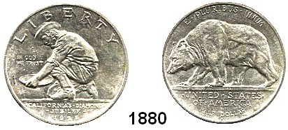 1880. U S A Gedenk Half Dollar 1925 S. California. Schön 161. KM 155. Index: Bären Tiere/Tierdarstellungen Kalifornien Ausländische Münzen Katalogseite Auktion: 163 Losnummer: 1880 Erhaltung: Fast prägefrisch Schätzpreis: 120,00 € Zuschlag: 220 €