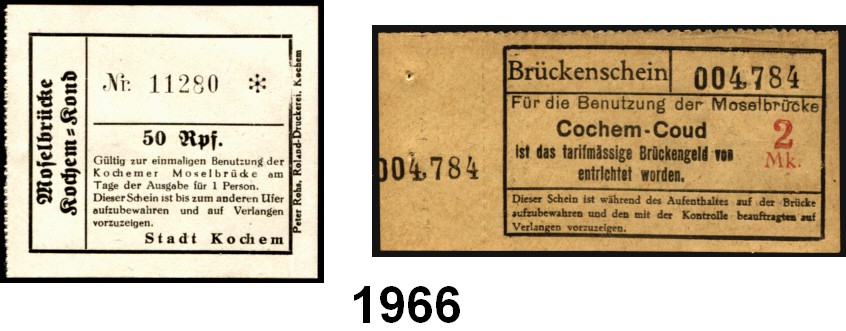 Brückengeld für die Moselbrücke Cochem-Coud. 2 Mark (41). Brückenscheinquittung mit französischer Nummerierung mit Abrissstück. Rückseitig ohne Stempel „Französische Zone“. Dazu Brückenquittung Stadt Kochem: 10(3), 20(8), 50(8) Reichspfennig. Schöne 6671. LOT. 60 Scheine.