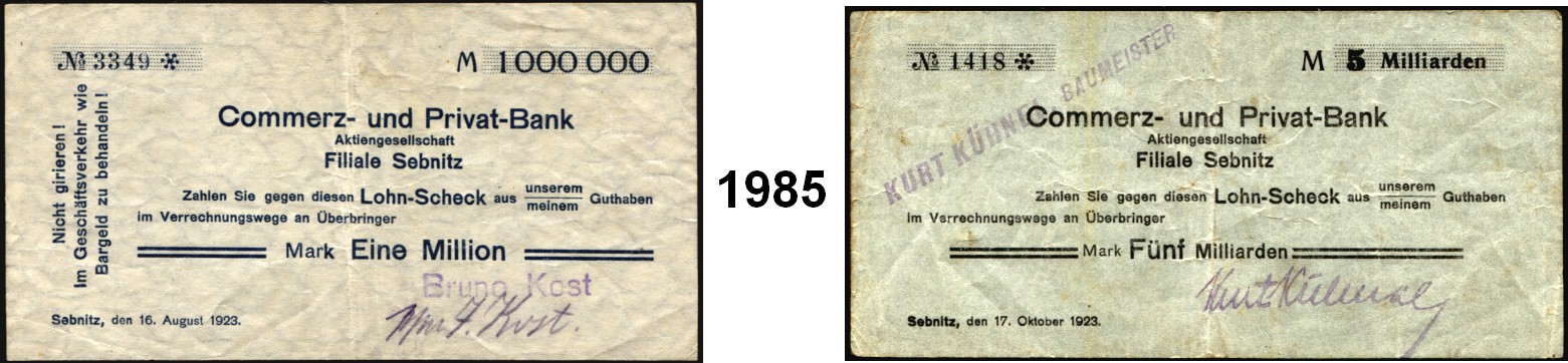 Commerz- und Privat-Bank Aktiengesellschaft, Filiale Sebnitz. Kundenschecks. 1 Million Mark 16.8.1923. Aussteller: Bruno Kost. 5 Milliarden Mark 17.10.1923. Aussteller: Kurt Kühnel, Baumeister. Beide Scheine nicht im Keller. Bühn 6673.AB.3., AF.3. Keller zu 4736.f.D, zu 4736.-.E. LOT. 2 Scheine.