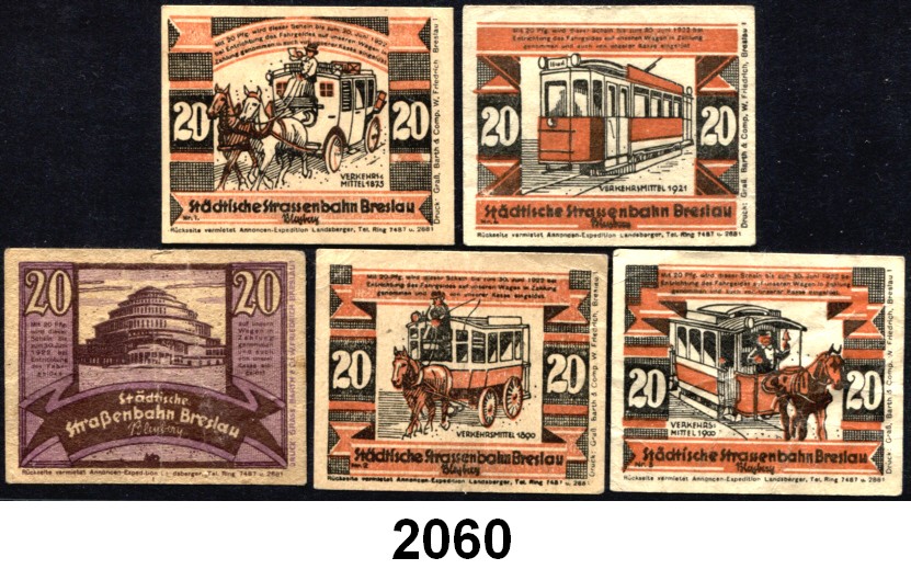 P A P I E R G E L D   -   N O T G E L D,Schlesien Breslau Städtische Straßenbahn.  5x 20 Pfennig o.D.(Juni 1921)-30.6.1922.  G/M 187.3(Jahrhunderthalle), 187.4 (komplett 1875-1921, Reklameaufdrucke 1, 2, 11, 15).  LOT 5 Scheine.