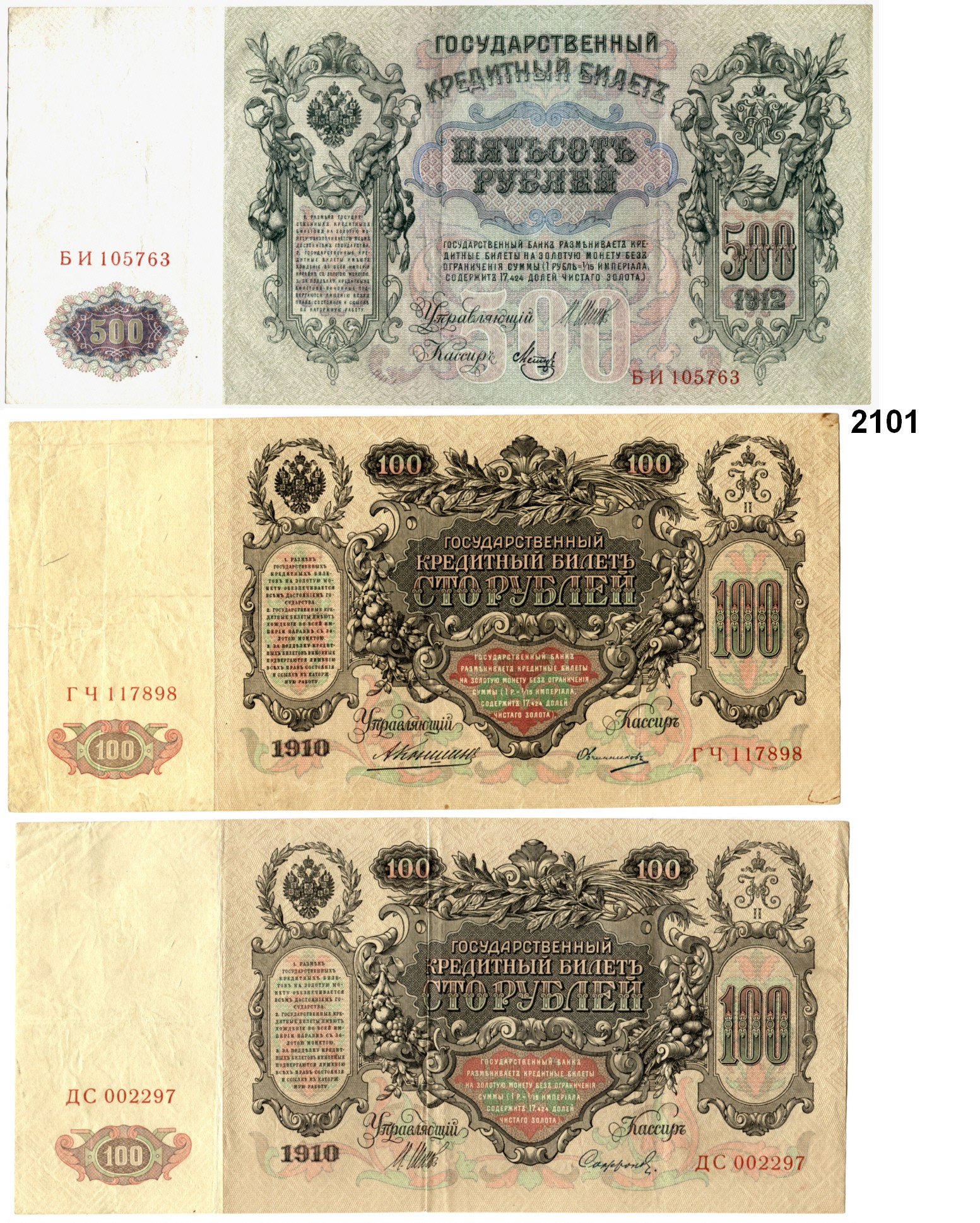 2101. AUSLÄNDISCHES PAPIERGELD Russland 100(2) Rubel 1910 und 500 Rubel 1912. Pick 13 a, 13 b, 14 b. LOT 3 Scheine. Papiergeld Katalogseite Auktion: 163 Losnummer: 2101 Erhaltung: Gebraucht Schätzpreis: 20,00 € Zuschlag: 15 €