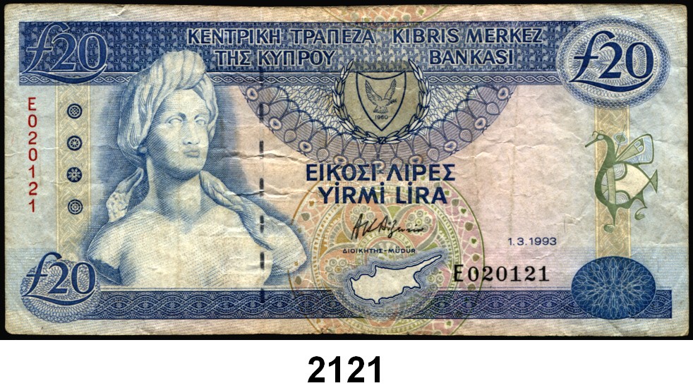 2121. AUSLÄNDISCHES PAPIERGELD Zypern 20 Pfund 1.3.1993. Pick 56 b. Papiergeld Katalogseite Auktion: 163 Losnummer: 2121 Erhaltung: Stärker gebraucht Schätzpreis: 20,00 € Zuschlag: 38 €