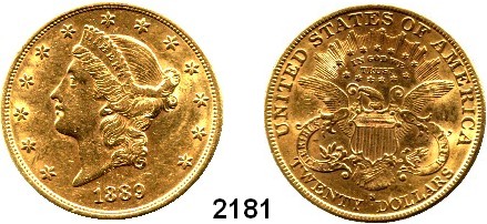 2181. U S A 20 Dollars 1889 S (30,09g fein). Kahnt/Schön 52. KM 74.3 Fb. 178. GOLD. Index: Goldmünzen / Goldmedaillen Ausländische Münzen Katalogseite Auktion: 168 Losnummer: 2181 Erhaltung: Sehr schön** Schätzpreis: 1600,00 € Zuschlag: 1600,00 €