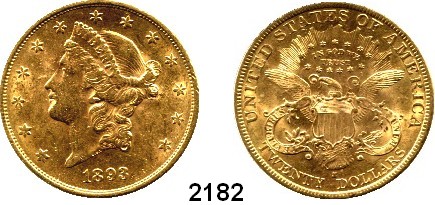 2182. U S A 20 Dollars 1893 S. (30,09g fein). Kahnt/Schön 52. KM 74.3 Fb. 178. GOLD. Index: Goldmünzen / Goldmedaillen Ausländische Münzen Katalogseite Auktion: 168 Losnummer: 2182 Erhaltung: Fast vorzüglich** Schätzpreis: 1700,00 € Zuschlag: 1800,00 €