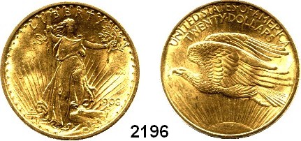 2196. U S A 20 Dollars 1908. (30,09g fein). Ohne Motto. Schön 142. KM 127 Fb. 183. GOLD. Index: Goldmünzen / Goldmedaillen Ausländische Münzen Katalogseite Auktion: 168 Losnummer: 2196 Erhaltung: Vorzüglich** Schätzpreis: 1700,00 € Zuschlag: 1800,00 €