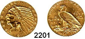 2201. U S A 5 Dollars 1911 (7,52g fein). Schön 139. KM 129. Fb. 148. GOLD. Index: Goldmünzen / Goldmedaillen Ausländische Münzen Katalogseite Auktion: 168 Losnummer: 2201 Erhaltung: Sehr schön +** Schätzpreis: 400,00 € Zuschlag: 460,00 €