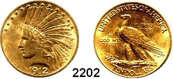2202. U S A 10 Dollars 1912. (15.04g fein). Schön 141.4. KM 130. Fb. 166. GOLD. Index: Goldmünzen / Goldmedaillen Ausländische Münzen Katalogseite Auktion: 168 Losnummer: 2202 Erhaltung: Sehr schön – vorzüglich** Schätzpreis: 850,00 € Zuschlag: 900,00 €
