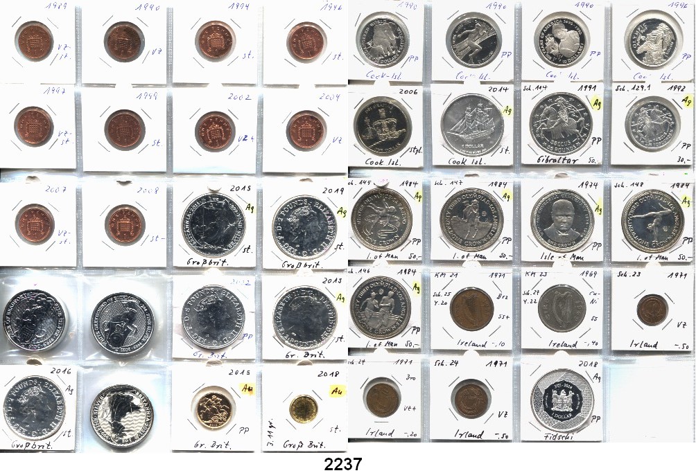 LOT. von 79 Münzen. Englischsprachiger Raum. Darunter 20 Silbermünzen und zwei Goldmünzen. GB(60) u.a. Silberunze „Britannia“ 1999, 2015, 2016, 2019, 2021; 2 Unzen 2019, 2021; 10 Pfund 2018 (1/10 Goldunze); Sovereign 2015; Cook Inseln(6) u.a. Silberunze 2014; Gibraltar(2); Isle of Man(5); Irland(5); Fidschi, Silberunze 2018. Meist im Münzrähmchen.