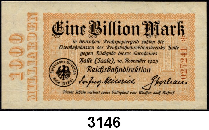 P A P I E R G E L D   -   N O T G E L D,Reichsbahn Halle (Saale)500.000 Mark 1.10.1923 bis 1 Billion Mark (ksfr.) 10.11.1923.  Müller/Geiger/Grab.  010.1 bis 010.11.  LOT 10 verschiedene Scheine.500.000 Mark 1.10.1923 bis 1 Billion Mark (ksfr.) 10.11.1923. Müller/Geiger/Grab. 010.1 bis 010.11. LOT 10 verschiedene Scheine.