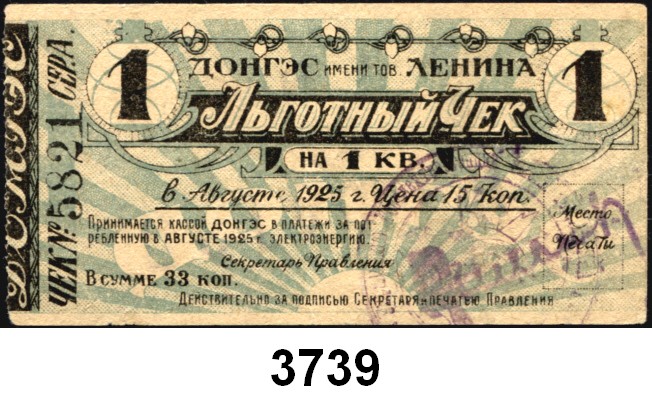 3739. AUSLÄNDISCHES PAPIERGELD Russland DON-Gesellschaft für Elektrizität „Lenin“. Rabattgutschein im Wert von 15 Kopeken für 1 Kilowatt Strom. August 1925. Div. Abstempelungen. Papiergeld Katalogseite Auktion: 159 Losnummer: 3739 Erhaltung: Leicht gebraucht Schätzpreis: 30,00 € Zuschlag: 200,00 €