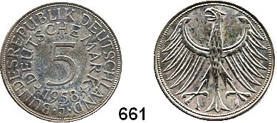 0661. B U N D E S R E P U B L I K 5 Mark 1958 J. Jaeger 387. Bundesrepublik Katalogseite Auktion: 170 Losnummer: 0661 Erhaltung: Sehr schön Literaturnummer: 387 Schätzpreis: 200,00 € Zuschlag: 220,00 €