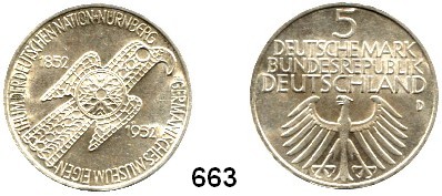 0664. B U N D E S R E P U B L I K 5 Mark 1952 D. Jaeger 388. Germanisches Museum. Index: Nürnberg Bundesrepublik Katalogseite Auktion: 170 Losnummer: 0664 Erhaltung: Geputzt, vorzüglich Literaturnummer: 388 Schätzpreis: 200,00 € Zuschlag: 230,00 €