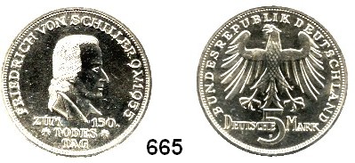 0666. B U N D E S R E P U B L I K 5 Mark 1955 F. Jaeger 389. Friedrich von Schiller. Bundesrepublik Katalogseite Auktion: 170 Losnummer: 0666 Erhaltung: Vorzüglich Literaturnummer: 389 Schätzpreis: 120,00 € Zuschlag: 110,00 €