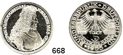 0668. B U N D E S R E P U B L I K 5 Mark 1955 G. Jaeger 390. Markgraf von Baden „Türkenlouis“. Index: Baden-Baden Bundesrepublik Katalogseite Auktion: 170 Losnummer: 0668 Erhaltung: Prägefrisch Literaturnummer: 390 Schätzpreis: 125,00 € Zuschlag: 110,00 €