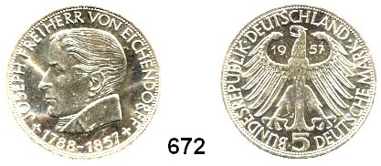 0672. B U N D E S R E P U B L I K 5 Mark 1957 J. Jaeger 391. Joseph Freiherr von Eichendorff. Index: Eichendorff, Josef von Bundesrepublik Katalogseite Auktion: 170 Losnummer: 0672 Erhaltung: Prägefrisch Literaturnummer: 391 Schätzpreis: 110,00 € Zuschlag: 105,00 €