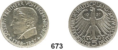 0673. B U N D E S R E P U B L I K 5 Mark 1957 J. Jaeger 391. Joseph Freiherr von Eichendorff. Index: Eichendorff, Josef von Bundesrepublik Katalogseite Auktion: 170 Losnummer: 0673 Erhaltung: Vorzüglich – prägefrisch Literaturnummer: 391 Schätzpreis: 100,00 € Zuschlag: 95,00 €