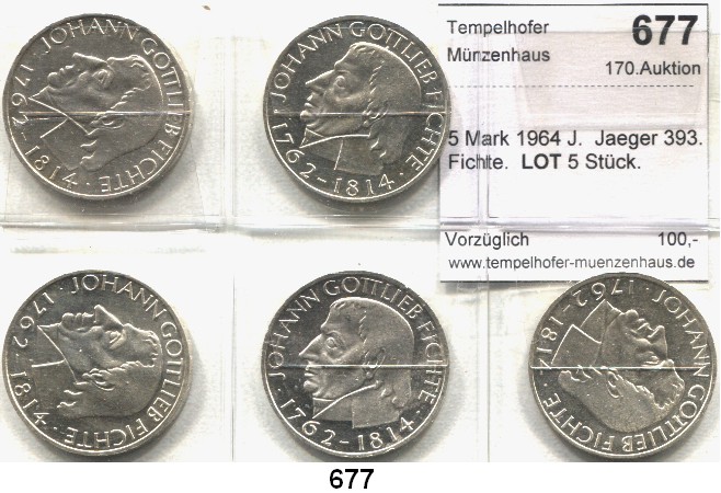 0677. B U N D E S R E P U B L I K 5 Mark 1964 J. Jaeger 393. Fichte. LOT. 5 Stück. Bundesrepublik Katalogseite Auktion: 170 Losnummer: 0677 Erhaltung: Vorzüglich Literaturnummer: 393 Schätzpreis: 100,00 € Zuschlag: 105,00 €
