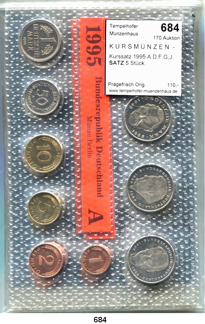 0684. K U R S M Ü N Z E N – S Ä T Z E Kurssatz 1995 A,D,F,G,J. SATZ. 5 Stück. Bundesrepublik Katalogseite Auktion: 170 Losnummer: 0684 Erhaltung: Prägefrisch Orig. Schätzpreis: 110,00 € Zuschlag: 90,00 €
