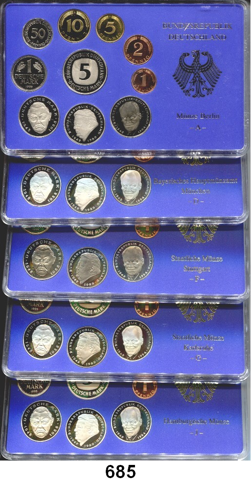 0685. K U R S M Ü N Z E N – S Ä T Z E Kurssatz 1995 A,D,F,G,J. SATZ. 5 Stück. Bundesrepublik Katalogseite Auktion: 170 Losnummer: 0685 Erhaltung: Polierte Platte Orig. Schätzpreis: 60,00 € Zuschlag: 70,00 €