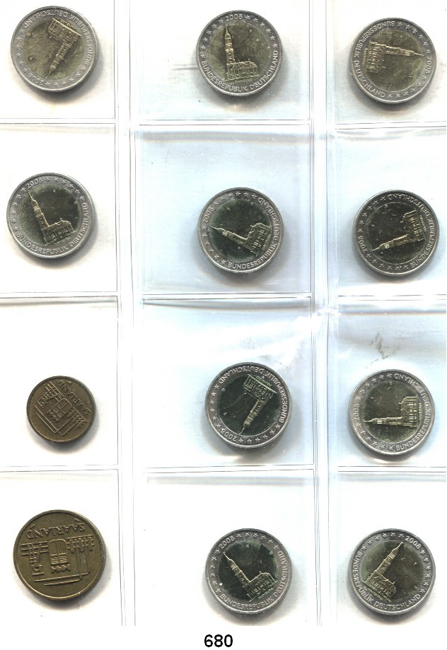 0680. B U N D E S R E P U B L I K 2 Euro 2008 F. Hamburger Michel. Fehlprägung mit alter Wertseite geprägt. (10 Stück). Beigegeben Saarland, 10 und 50 Franken 1954. LOT. 12 Stück. Bundesrepublik Katalogseite Auktion: 170 Losnummer: 0680 Erhaltung: Saarland sehr schön – vorzüglich sonst vorzüglich – prägefrisch Literaturnummer: 534 Schätzpreis: 80,00 € Zuschlag: 85,00 €