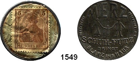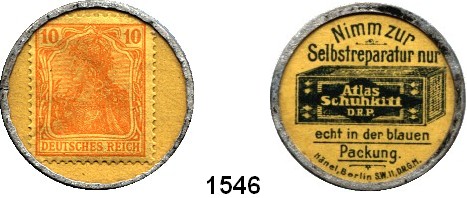 Notmünzen; Marken und Zeichen,0 Berlin Nimm zur Selbstreparatur Atlas Schuhkitt.  Briefmarkenkapselgeld  10 Pfennig Germania (MUG gelb).  Menzel 2289.2.
