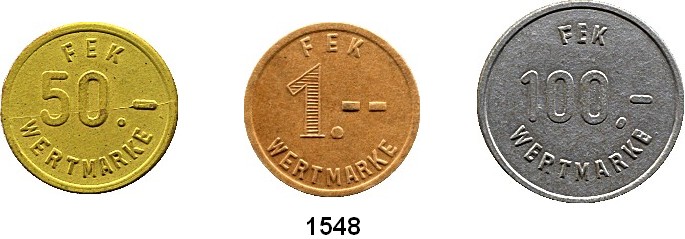 Notmünzen; Marken und Zeichen,0 Chemnitz (Sachsen) Karl-Marx-Stadt,  F E K.  (Fahrzeug-Elektrik-Karl-Marx-Stadt ??),  Einseitige farbige Wertmarken zu -,05; -,10; -,50; 1,--; 5,-; 10,-; 50,-; 100,-; 500,- und 1000,-.  LOT. 10 Stück.