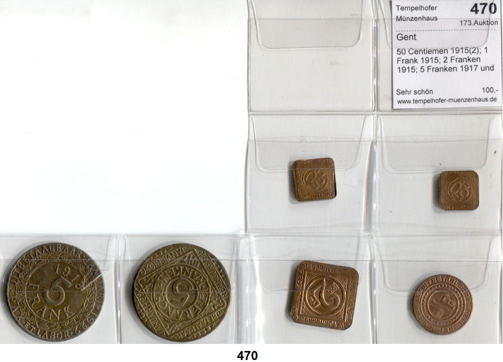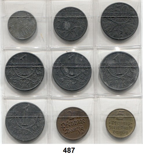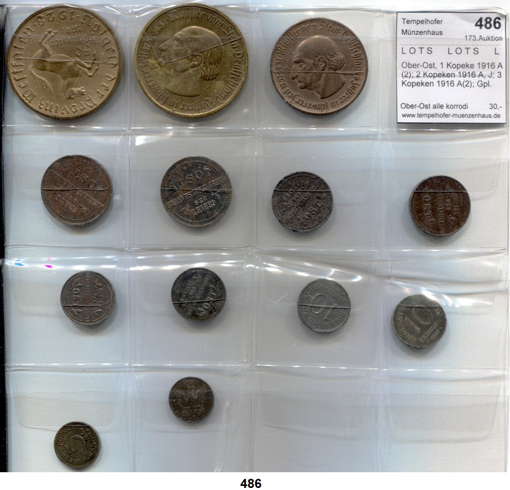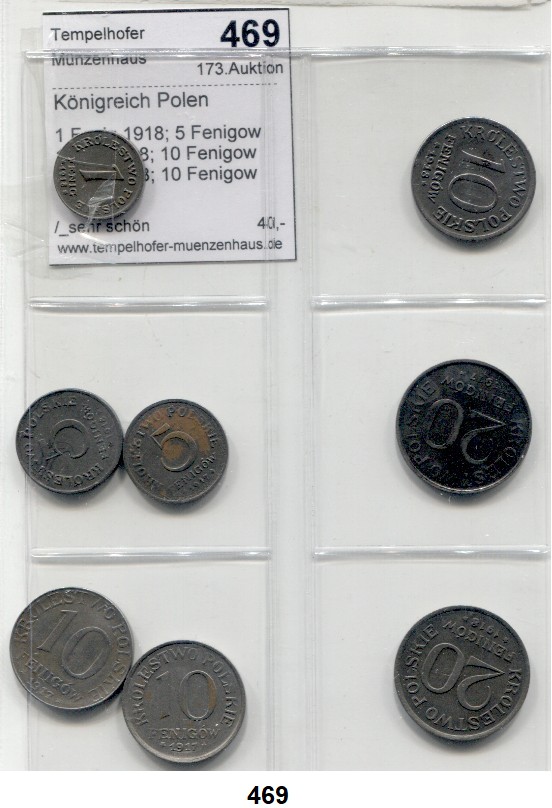 1 Fenig 1918; 5 Fenigow 1917, 1918; 10 Fenigow 1917, 1918; 10 Fenigow 1917 „Schrift bis an den Rand“; 20 Fenigow 1917 und 1918. LOT. 8 Stück.