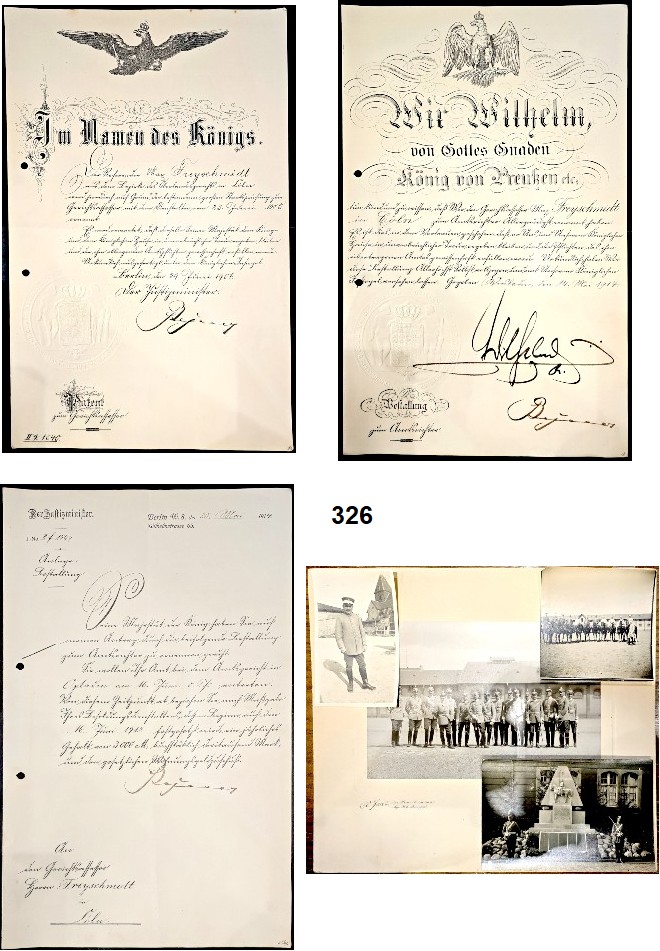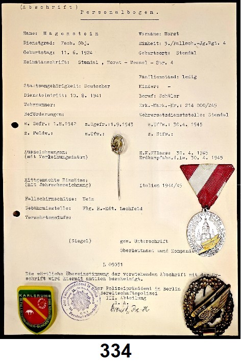 Umfangreicher Dokumenten Nachlaß eines ehemaligen Fallschirmjägers im 3./Fallsch.-Jg.Rgt. 4.. (Diensteintritt 10.8.1941, Entlassung aus der Kriegsgefangenenschaft 1.11.1948). Später im Berliner Polizeidienst am 30. November 1979 als Polizeihauptmeister in den Ruhestand versetzt. Mitglied im Bund der deutschen Fallschirmjäger e.V. in der Landeskameradschaft „Erich Walther“ in Berlin. LOT. von 22 Dokumenten, Urkunden, Schriftstücken; 5 Fotos; 3 Urkundenhefte „Deutsches Sportabzeichen“; 3 Urkunden „DLRG“. Dazu 4 Nachkriegsabzeichen u. a. Fallschirmjägertreffen Krems 1981.