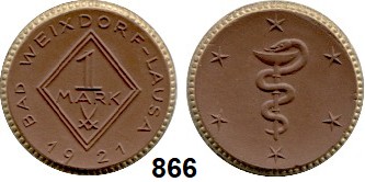 50 Pfennig 1921 braun, Rand, Außenlinien des Sechseckes, die beiden fünfstrahligen Sterne und das Firmenzeichen auf der Vs., sowie das Firmenzeichen auf dem Päckchen der Rs. gold. Gipsform. Reemtsma & Söhne. Menzel 6646.?.