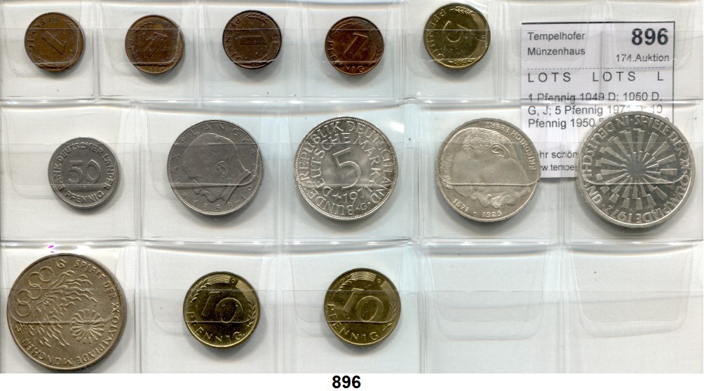 0896. L O T S L O T S L O T S 1 Pfennig 1949 D; 1950 D, G, J; 5 Pfennig 1971 D; 10 Pfennig 1950 D; 1971 G; 50 Pfennig 1949 F; 2 Mark 1958 F; 5 Mark 1971 G; Ebert; 10 Mark „in Deutschland“ J und „Flamme“ D. LOT. 13 Stück. Bundesrepublik Katalogseite Auktion: 174 Losnummer: 0896 Erhaltung: Sehr schön bis vorzüglich Schätzpreis: 50,00 €